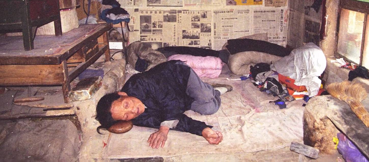 一个不足九平米的逼仄土屋里,墙上贴满泛黄的旧报纸,光线昏暗,库淑兰就踩着小脚在这个屋子里做饭,起居。