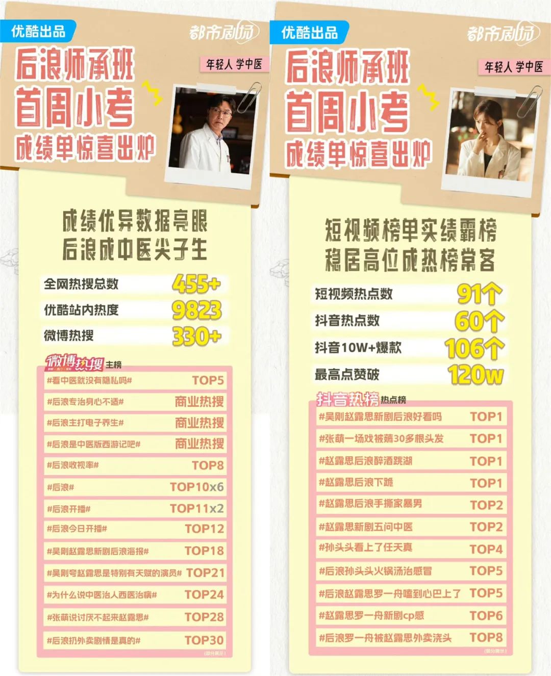 其中除了#赵露思罗一舟新剧CP感 等常规话题,如#后浪罗一舟被赵露思外卖浇头、#张萌一场戏被薅30多根头发、#赵露思后浪怒扇医闹男 等话题。而主话题#电视剧后浪 在抖音、快手的播放量分别达到22.9亿次、1.4亿次,#后浪 在快手还有7.4亿播放量。