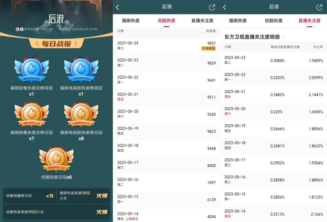 从数据来看,这部剧在5月14日开播后,表现出某种慢热,首日站内热度只有4094;然后在开播第五天,站内热度突然突破9000,此后连续多日都实现了9000+,并在猫眼、灯塔等热度榜已经连续拿下多个日冠、1个周冠,市占率和舆情都实现领跑。
