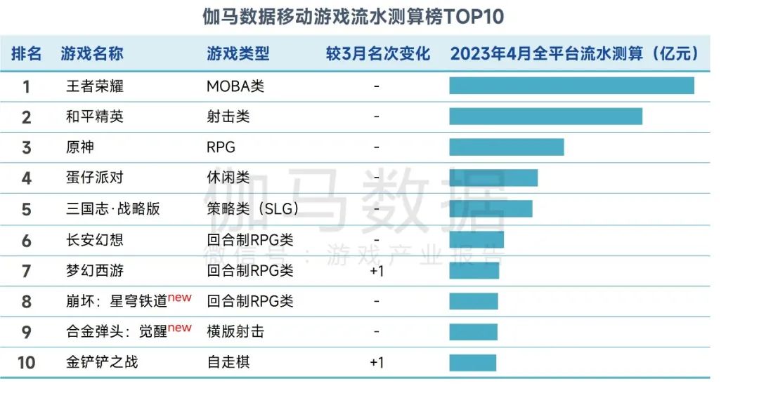 2023年4月,伽马数据移动游戏流水测算榜TOP10中前6款产品排名不变,包含3款回合制RPG类产品,2款新游上榜。