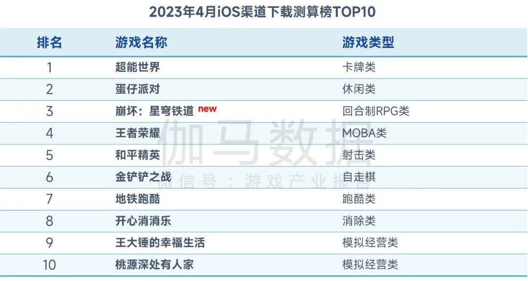 2023年4月iOS渠道境外下载测算榜TOP10中,新品《崩坏:星穹铁道》登顶,该产品上线前已积累较多热度,预下载阶段即进入多个国家或地区App Store免费榜TOP1。