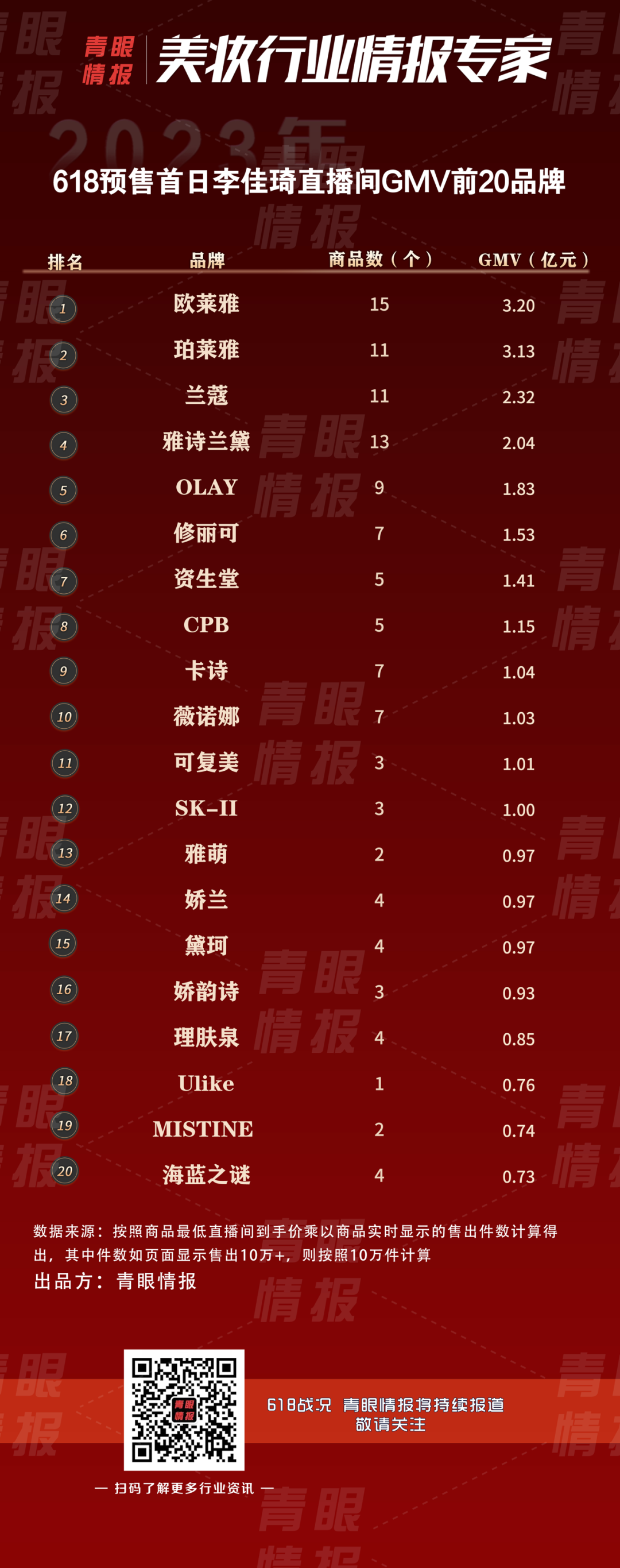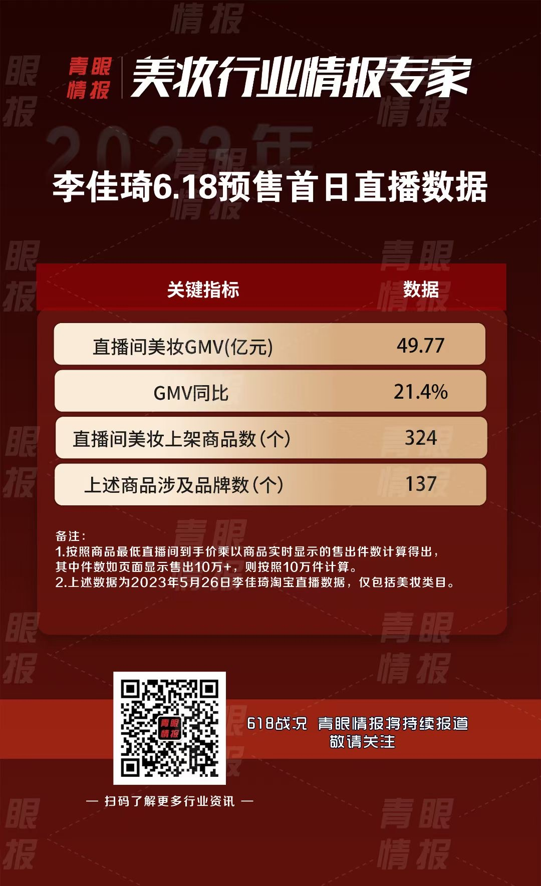 另据青眼情报统计发现,截至5月27日凌晨1:30,李佳琦直播间预售首日美妆GMV高达49.77亿元。