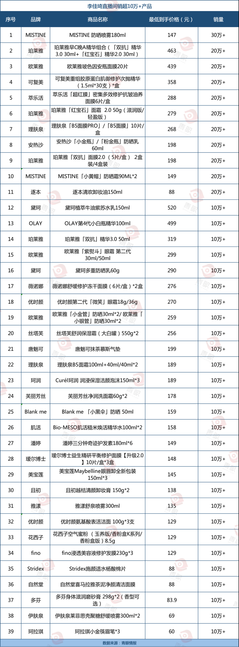 MISTINE防晒喷雾以30万+的销量遥遥领先,其次为珀莱雅早C晚A套装、欧莱雅玻色因安瓶面膜、可复美重组胶原蛋白肌御修护次抛精华、萃乐活「超红膜」密集多效修护抗皱油养面膜。