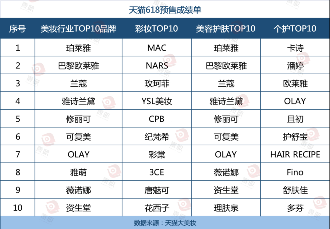 而据天猫今日公布的天猫美妆行业预售4小时品牌成绩单,排名前5的分别为珀莱雅、巴黎欧莱雅、兰蔻、雅诗兰黛和修丽可,和李佳琦直播间的热门品牌基本吻合。