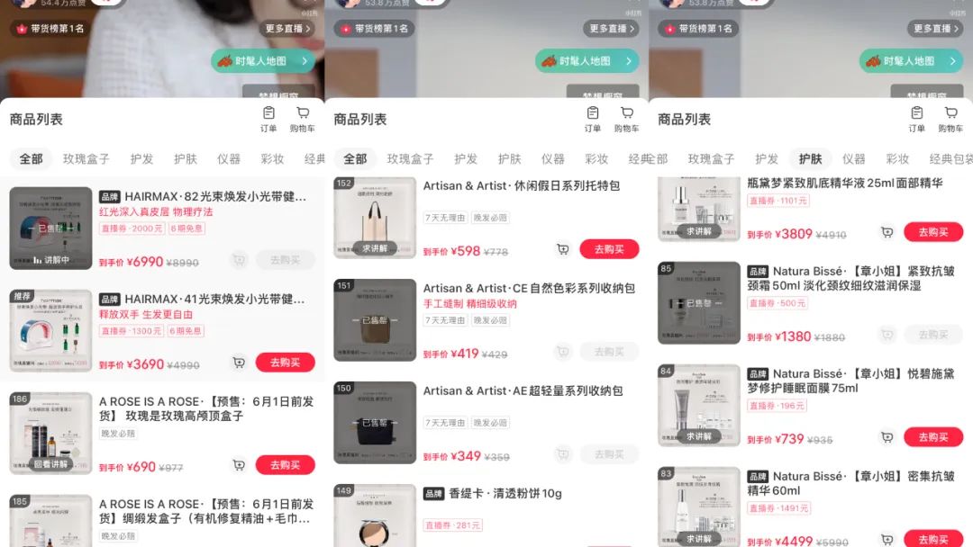 整场直播,186个品,覆盖护发、护肤、仪器、彩妆、经典包袋等多个品类。值得关注的是,本次直播,章小蕙拿出了一年只上架两次的“玫瑰盒子”(章小蕙个人品牌的礼盒),其为护发、护肤商品组合套装,包括高颅顶盒子、瘦腿盒子、夏日体香盒子等系列,覆盖MALIN+GOETZ、MY.ORGANICS等多个小众品牌,每个盒子都做了跨品牌的组合SKU,价格在400元至千元不等。