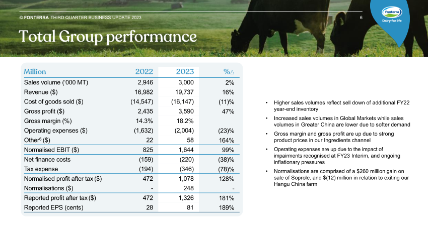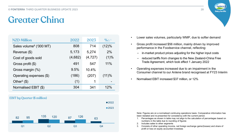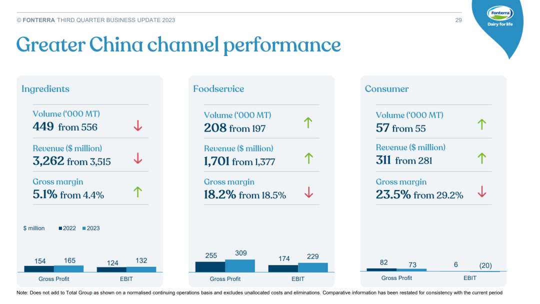 小食代翻阅的财报显示,2023财年前9个月,恒天然大中华区的收入为52.47亿新西兰元(约合人民币225.60亿元),同比增长2%;调整后息税前利润(EBIT)为3.41亿新西兰元(约合人民币14.66亿元),同比增长12%。