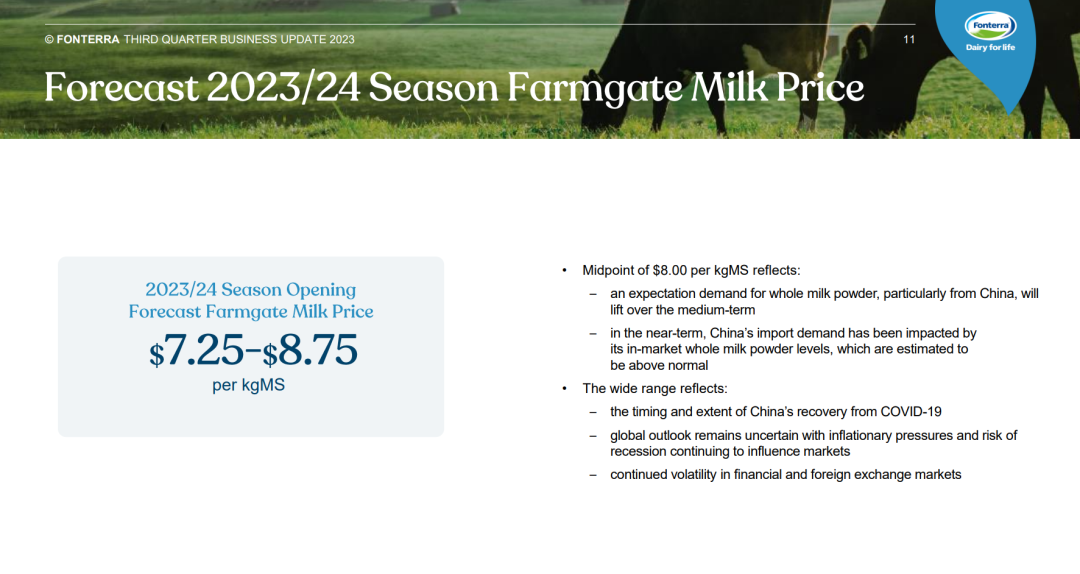 今天,恒天然宣布,2023/24奶季的原奶收购预期价格区间为每公斤乳固体7.25-8.75新西兰元,区间中位值为每公斤乳固体8.00新西兰元。同时,提高2023财年的每股收益指引。