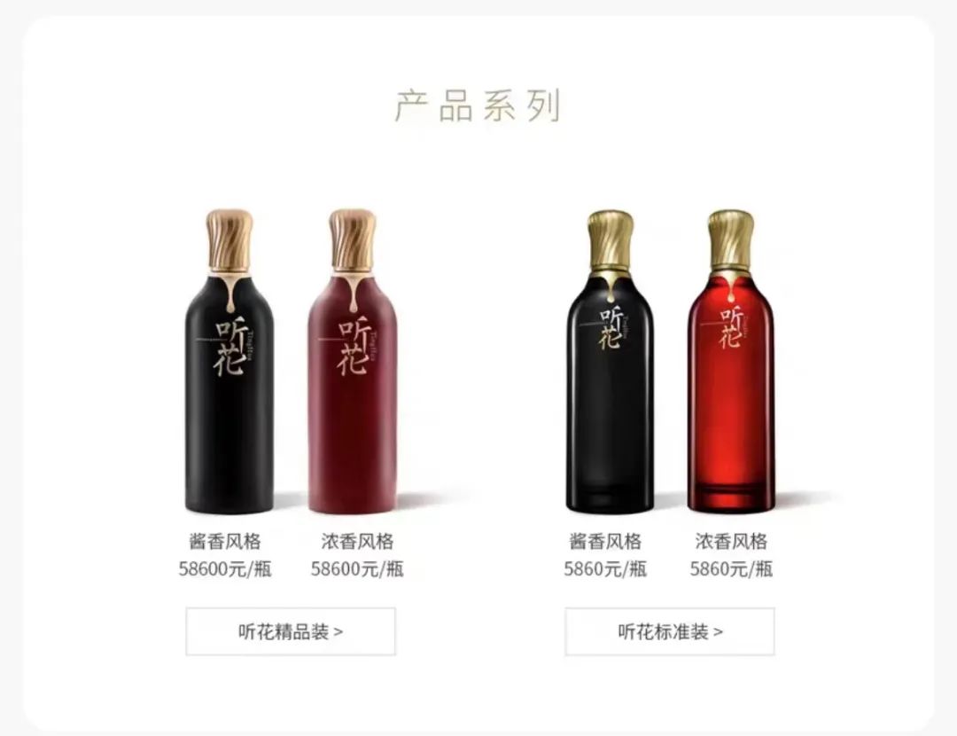 听花酒分酱香和浓香两种,标准装定价为5860元/瓶,精品装售价高达58600元/瓶。在其天猫旗舰店中,个位数的销量的确也反应了销量不佳的影子。