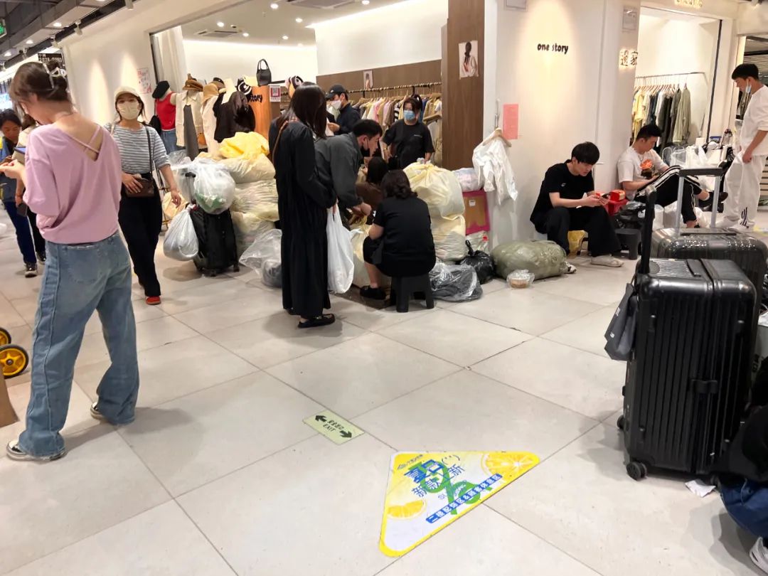另一边,一家叫做“尚忆”的档口也十分热闹。由于台下围坐看货的人太多,且档口处于电梯口的过道,时不时还会出现“交通堵塞”。“让一让”“别堵过道”……拉着包裹的快递小哥、打包的阿姨们时不时地喊上一句。