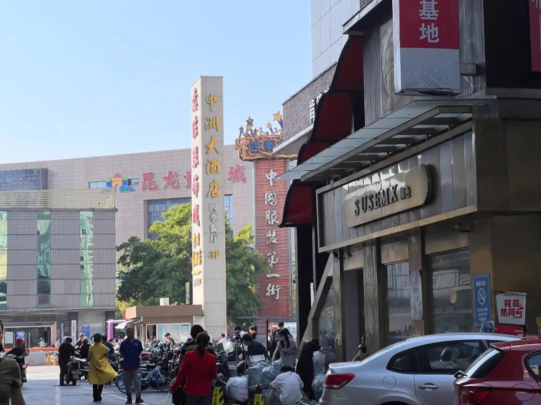 来回穿梭的拉包的三轮板车、拉客的摩的、市场门口密密麻麻的快递包和快递小哥们,以及街头用手推车拉着装满衣服的黑袋、皮箱,匆匆出入一家又一家档口的实体店店主们,共同构成了四季青街头的图景。