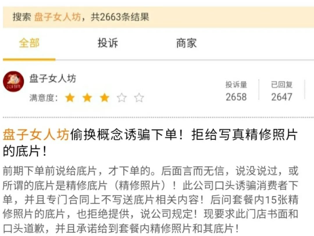 由此可见,即便盘子女人坊靠着差异化路线脱颖而出,但在发展壮大的过程中,盘子女人坊依然没能跳脱出传统影楼那些“坑人”的潜规则。