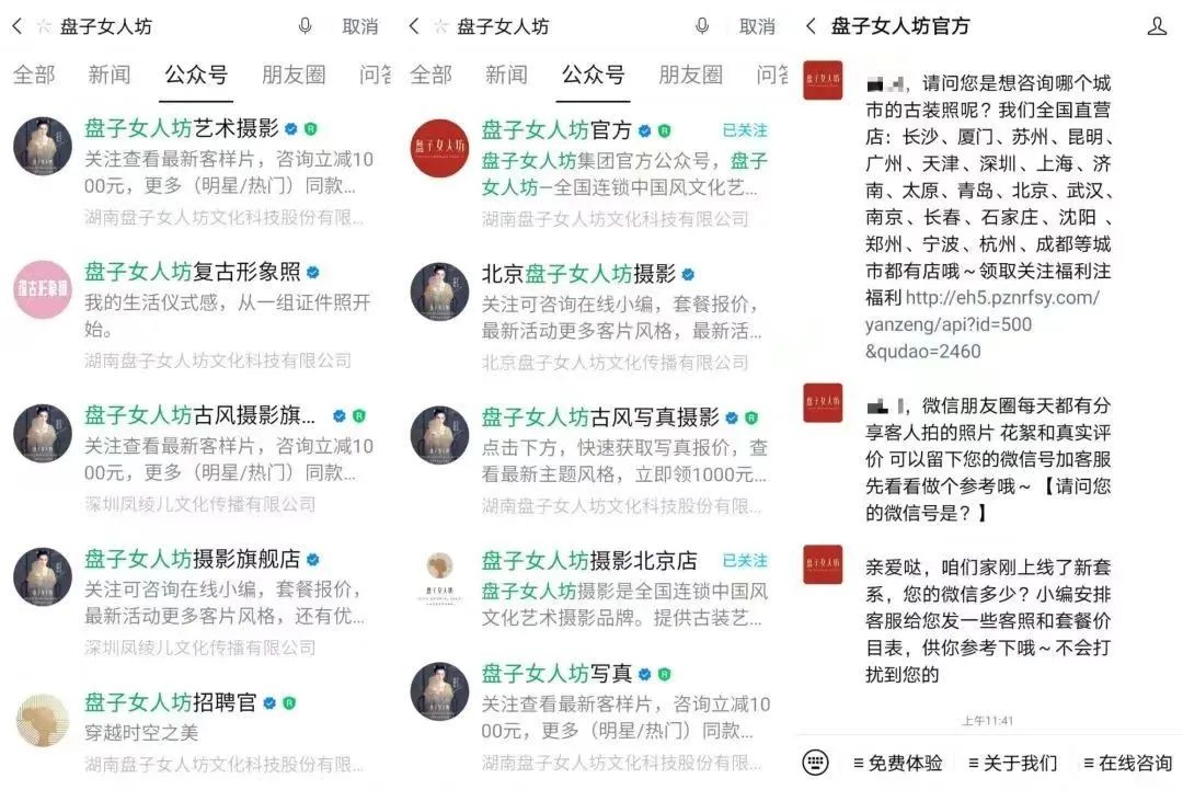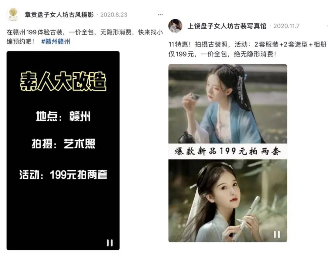 为快速获客,盘子女人坊还频频出现在QQ、腾讯新闻、腾讯视频、抖音、微博等众多平台上,全渠道、集中性的广告几乎覆盖所有生活场景。“两位数价格圆一个古装女主梦”、“XX星座的女生免费拍照”,精致的古风图片,配上极具煽动性的广告语,年轻女性很容易就会陷进去。