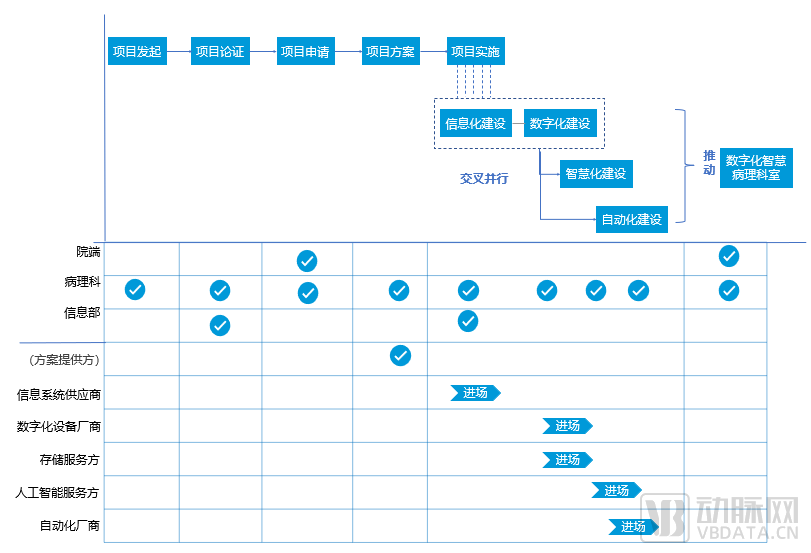 分阶段交叉建设是落地的关键。对于三级医院来说,数字化智慧病理科建设是一个长周期建设项目,预计需要3-5年的建设周期。根据建设目标,分阶段建设,不同建设阶段之间呈现并行、交叉建设是贴近实际的有效方案。