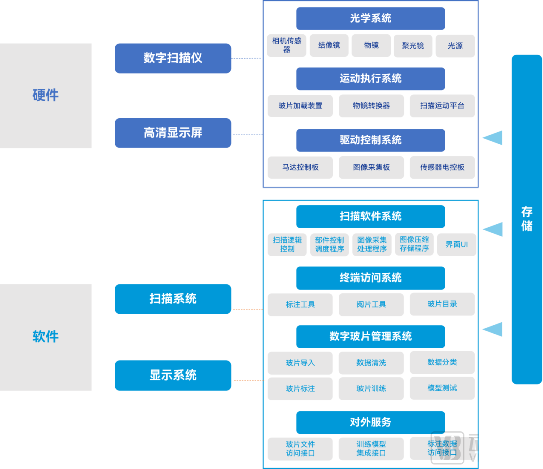 扫描模块核心是扫描仪的配备。扫描仪是将物理切片转化为数字切片的基础。扫描仪的质量决定了输出图片的压缩情况,直接影响显示成像的质量,是数字切片能否还原模拟实体切片的第一步。