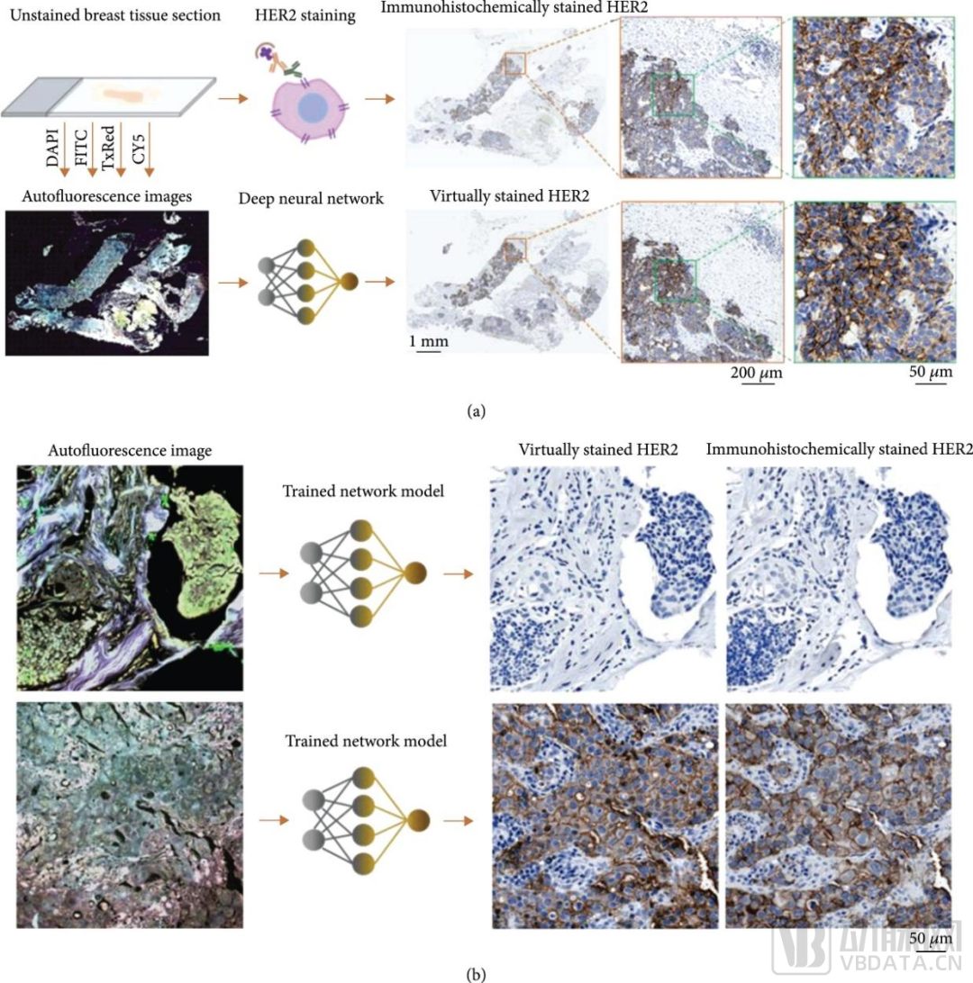 AI可应用于数字病理染色环节。一方面,可以通过深度学习技术对染色过程进行自动化控制和智能优化,提高数字病理图像的染色质量。另一方面,未来或能实现虚拟染色。传统方式是通过化学试剂染色,存在成本高和周转时间长的问题。根据加州大学洛杉矶分校的研究团队最新技术,可以基于AI深度学习功能,对物理切片进行虚拟HER2染色。生物组织在吸收光时会产生自发荧光信息,通过捕获未染色组织的自发荧光信息和深度神经网络,可以快速将这些无染色的自发荧光图像转换为虚拟组织学图像,显示出准确的颜色和对比度。这种虚拟染色过程每个样本只需几分钟,且不需要昂贵的设备或有毒化学品。仅通过一台计算机,就可以在染色环节实现更快、更经济的完成效果。