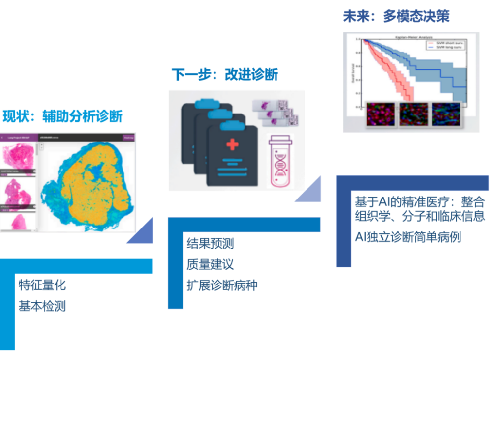 在诊断方面,在病例发送给病理医生之前,可以用AI帮助筛查意外事件,例如组织污染、微生物污染等;在诊断结束后,还可以用AI进行复核,给出错误警告。