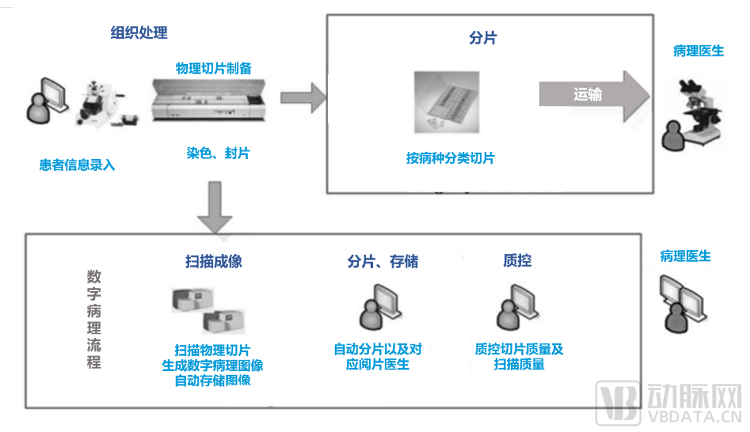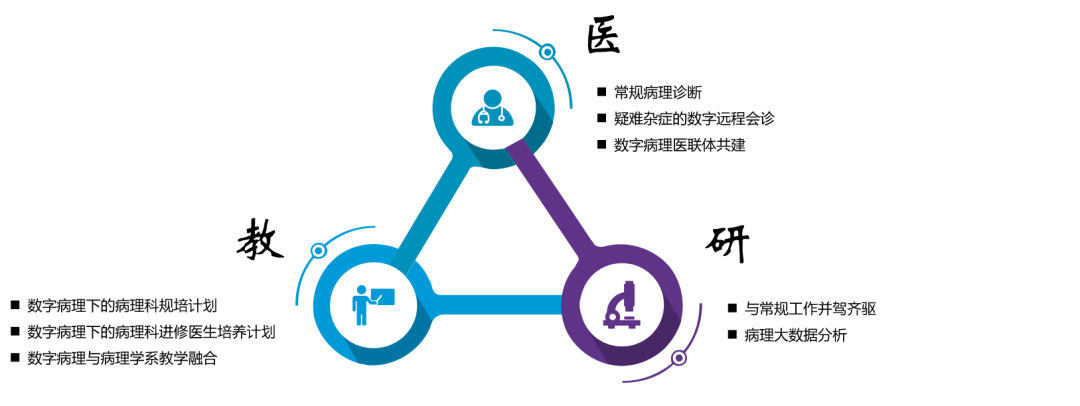数字病理是一种基于图像的动态环境,能够采集、管理和解释从数字化切片生成的病理信息。通俗来讲,是指通过扫描技术对病理数据进行数字化采集(将传统病理的物理切片转换成高分辨率数字图像),医生通过数字化切片生成的信息进行病理诊断以及病理数据管理。数字病理是数字成像技术(又称计算机成像技术)在病理学领域的成功实践,包括临床和非临床两方面的应用。临床应用:包括通过数字病理图像进行日常病理学诊断以及开展远程病理诊断。非临床应用:包括科研和教学。
