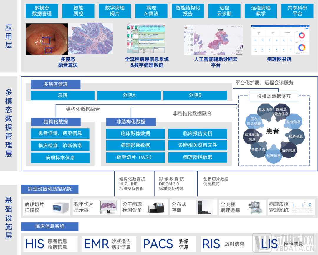 其次,除了病理业务信息系统的搭建外,要实现全环节信息化还需要对工作环节涉及到的多个信息系统进行集成,以实现院内、院际的信息互联互通。信息系统的集成分为三个方面:应用系统集成、医院系统集成、生态系统的集成。
