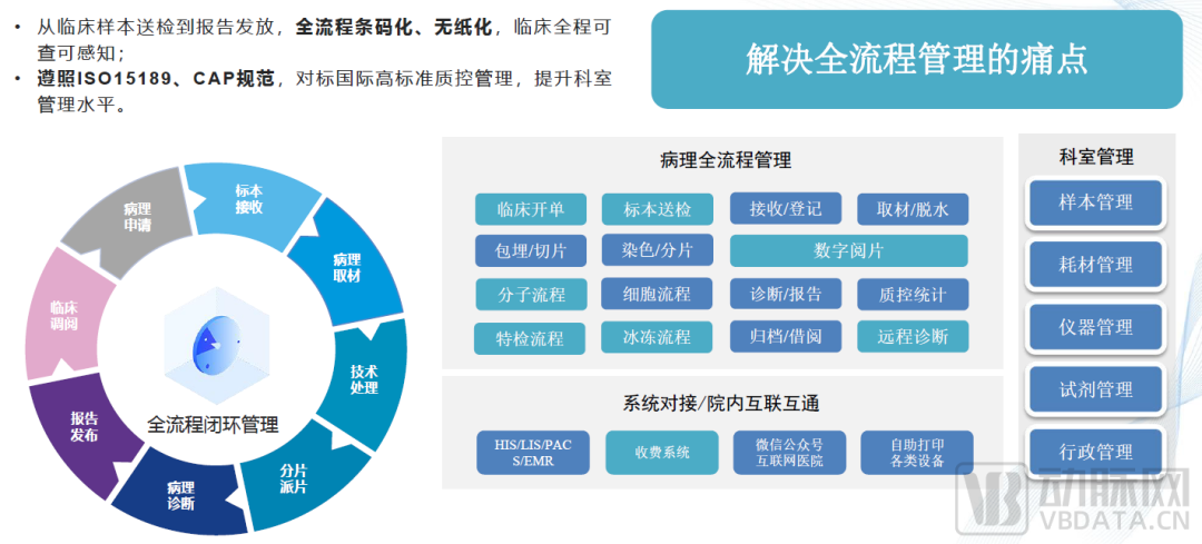 科室全流程运转:依托数字信息系统,优化科室协同效率和工作流程管理。病理科工作流程分为标本送检、登记、取材、制片(脱水、包埋、切片、染色)、诊断、报告出具、归档。传统工作流程的运转依赖人工操作以及实物载体(纸质记录、物理切片等),通过建立全流程信息管理系统以及标本追踪系统,可以实现全工作流程无纸化、质控管理精细化。