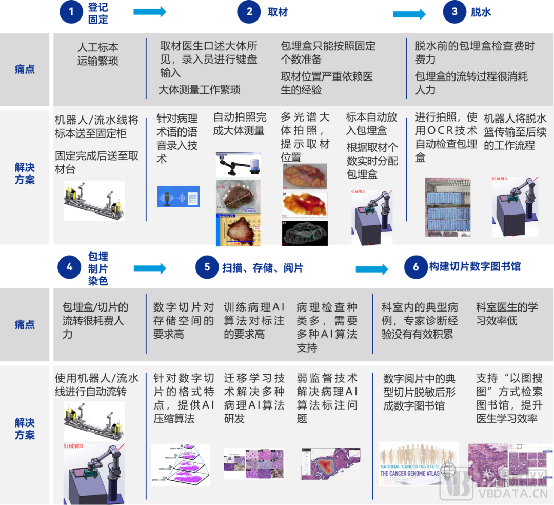 在实现数字化工作流程之前,传统病理科主要是依靠人工操作、显微镜诊断来实现科室运转。数字病理、AI技术的出现为传统病理工作模式带来了创新范式,主要体现在以下几个环节。