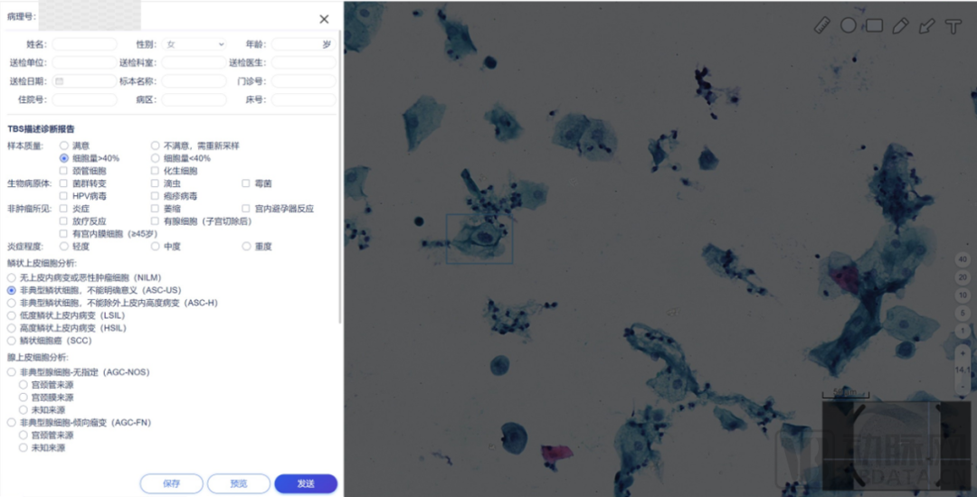 诊断报告模块:AI技术可以自动输出结构化报告。AI会根据分析结果,给病理医生提供参考诊断结论。目前除了宫颈细胞学之外, AI诊断仍未获得其他方向的三类证;因此现阶段,病理医生仍需要对、AI诊断结果进行人工审核,对于存疑病例进行修改后自动生成诊断报告。