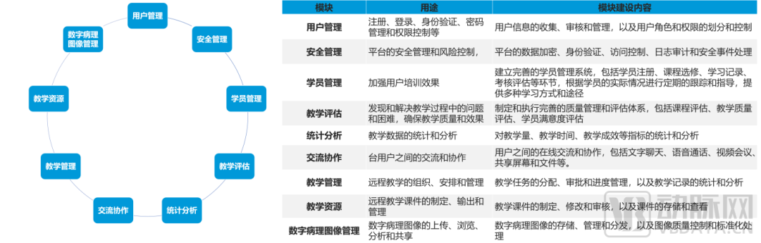 数字病理切片的出现彻底改变了病理学教学的模式,利用数字切片可以突破培训规模、地点、人员的限制。教学平台基于教学数据库以及远程教学系统可实现线上教学、培训等功能,促进医学教育的发展。除了同样需要用户管理、交流协作、安全管理模块外,还需要设置教学相关模块,如教学课件的输出与展示、教学任务的分配、教学成果的统计,还可以针对具体教学需求,设置规培测试、教学打分等。