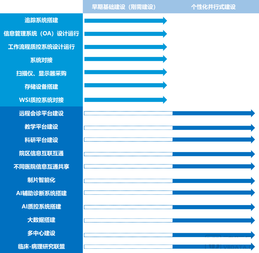医院根据建设需求,以并行式建设的方式推动落地。在资金有限的情况下,首先应该覆盖基础性建设,包括追踪系统搭建、PIS系统的建设与运行、质控系统设计与运行、系统对接、扫描仪采购、专业数据存储设备建设。同时,根据医院自身的偏好和需求,对科研教育应用平台、生态链信息互联互通、智能化制片、AI辅助诊断系统、AI质控系统、大数据库搭建、多中心建设、临床-病理联盟等工作进行优先级排序,同步与基础性建设并行展开建设。