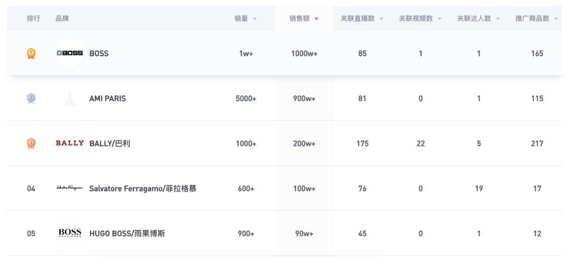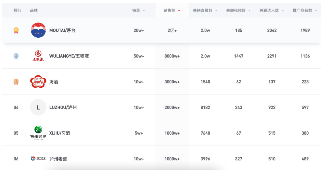 从“关联”的数据则可以看出二者在抖音上的渗透率差异。奢侈品分类销量TOP5的关联直播数、关联视频数、关联达人数分别为462、23、27;而白酒分类销量TOP5则分别为5.73w、2004、5907。两厢对比高下立判。