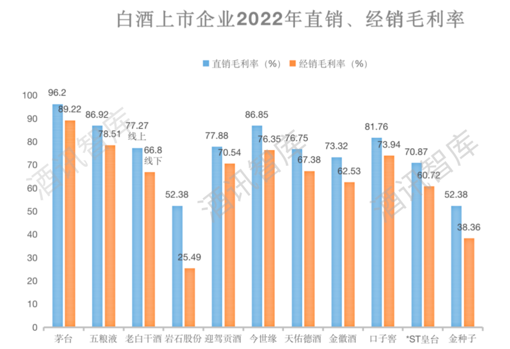 这里需要提到的是,这种缩短厂家与终端沟通链路的方式在增强厂家对产品管控力的同时,其中直销这一模式还增强了厂家的盈利能力。从上市酒企来看,直销(线上)毛利率几乎都高于经销商毛利率。