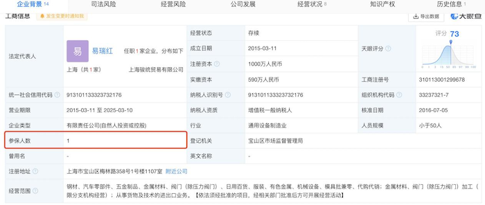 天眼查显示,该公司成立于2015年3月11日,注册资本1000万元,但参保人数仅有1人。
