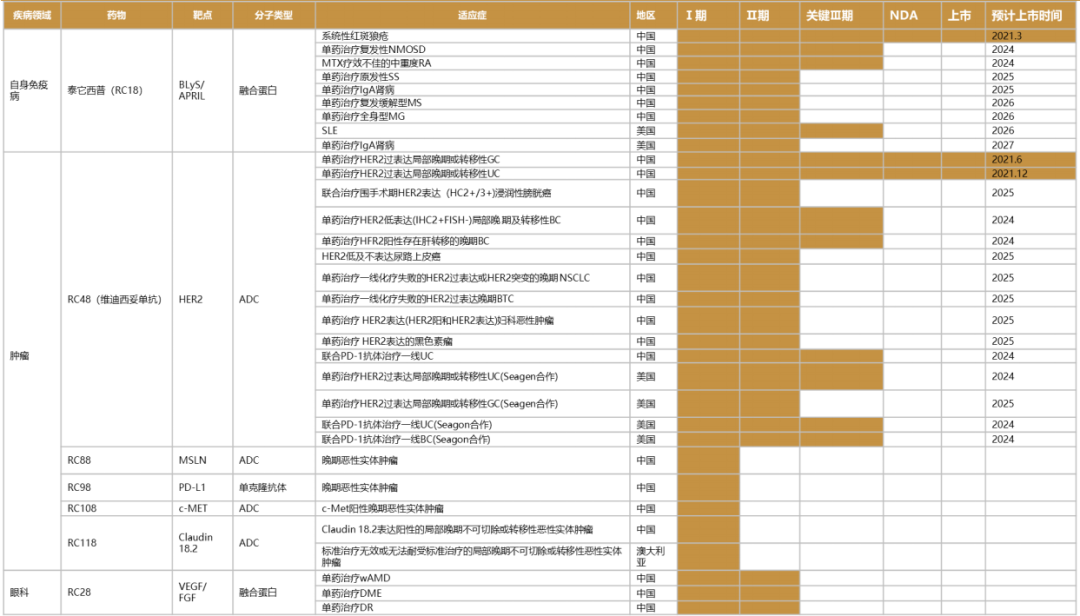 目前,荣昌生物已经有两款产品成功商业化,分别是HER2靶点ADC药物RC48,以及自身免疫性疾病药物泰它西普(RC18)。纵观全球市场,这两款药物都有着较强的竞争力,甚至有机会争夺更大的国际市场。