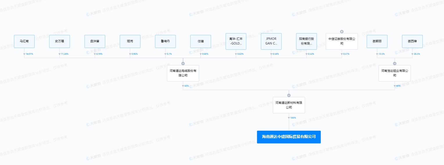 天眼查显示,海南通达中盛国际贸易有限公司成立,注册资本5000万元,经营范围包含:金属材料销售;有色金属合金销售;供应链管理服务;国内贸易代理等。股权穿透显示,该公司由通达股份、河南浩达铝业有限公司间接共同持股。