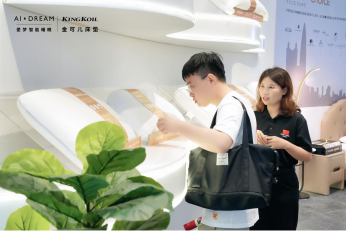 本次深圳家具展上,金可儿首次推出的小件馆——金可儿“绵眠屋”,吸引了大量观众驻足。该展区涵盖多款系列枕头、床柜等,以温柔质感的寝室小件,营造一个充满治愈感和温馨舒适的睡眠环境。