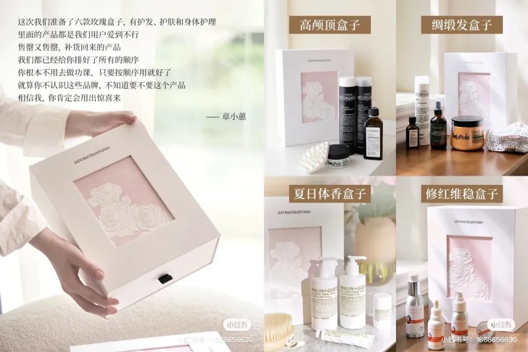 但章小蕙个人品牌出品的“玫瑰盒子”,是她根据自己的经验,把不同品牌(尤其是小众品牌)的产品组合在一起的,一套使用下来,就能完成一个护发、护肤等流程。