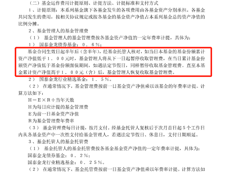 截至2022年11月17日,该基金最新的《招募说明书》显示,国泰金龙仍采用“净值低于1元,暂收管理费”的方式。