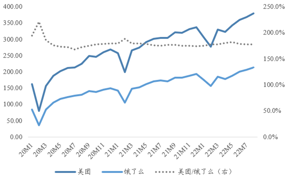 接入商家数给出了更直观的对比,截至2022年底,美团财报公布的接入商家数已经达到900万家,而有媒体根据阿里零售通信息推测,同期饿了么的商家数量在600万左右。更有媒体报道称,美团的骑手数量超过饿了么的1.5倍,二者在运力上的差距日趋明显。