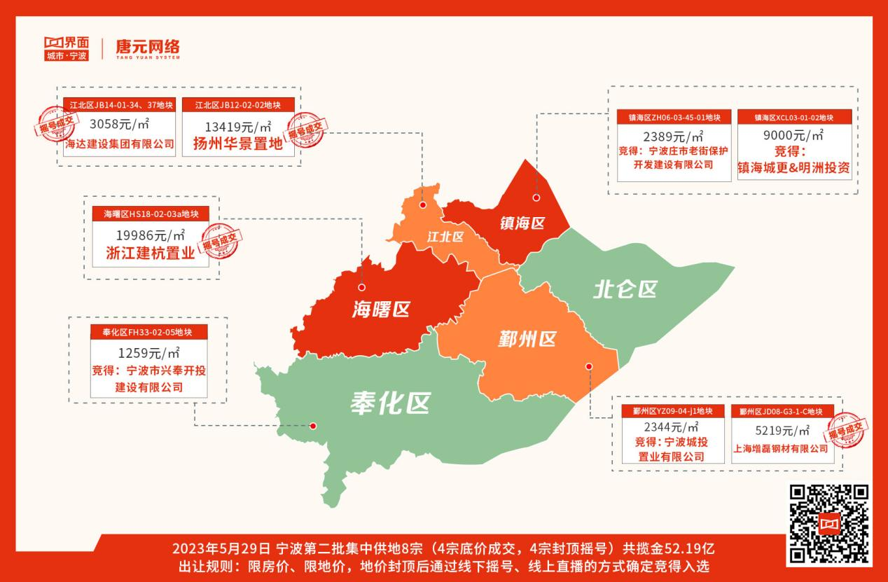 5月29日,万众瞩目的宁波2023年度二批次土拍顺利收官,8宗地块全部成交,其中4宗地块进入触顶摇号阶段,总计收入金额约52.2亿。