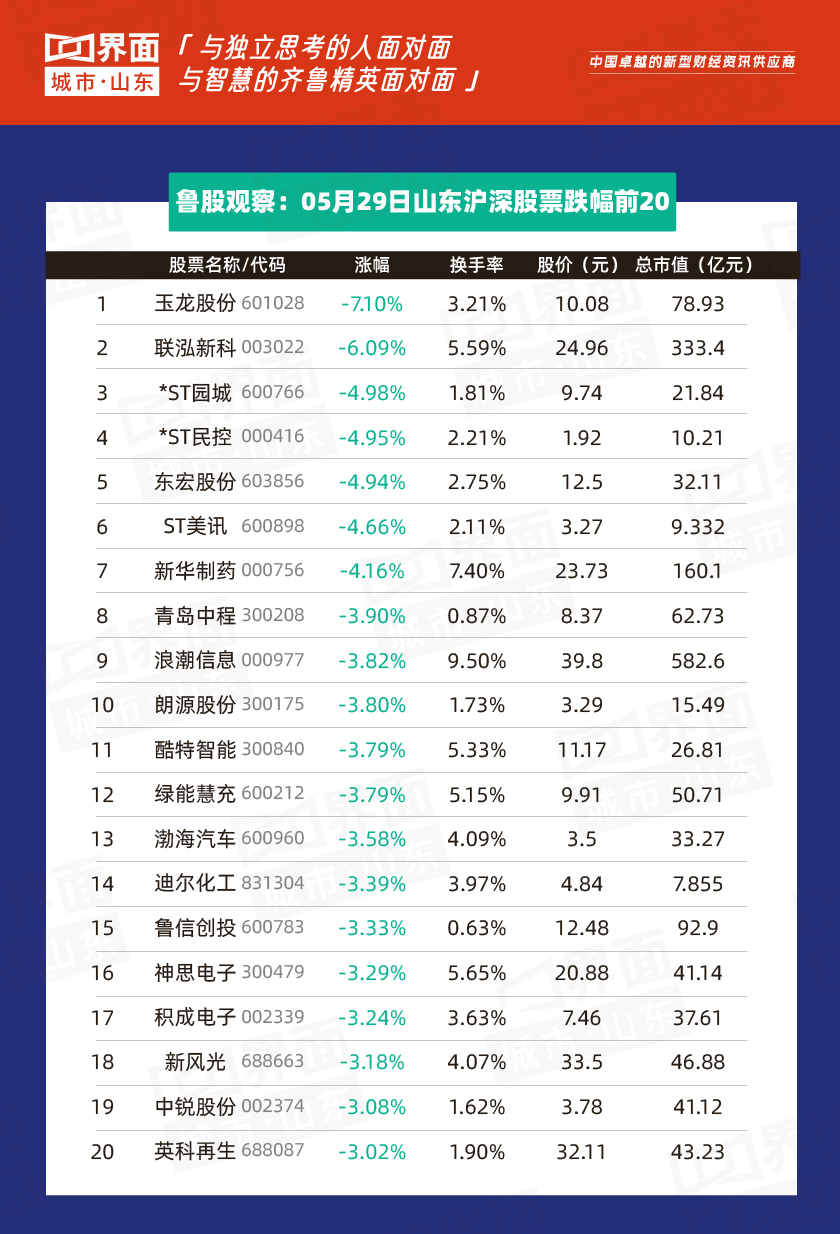 烟台市跌幅榜首:*ST园城(600766),跌幅4.98%,股价9.74元,总市值21.84亿元。