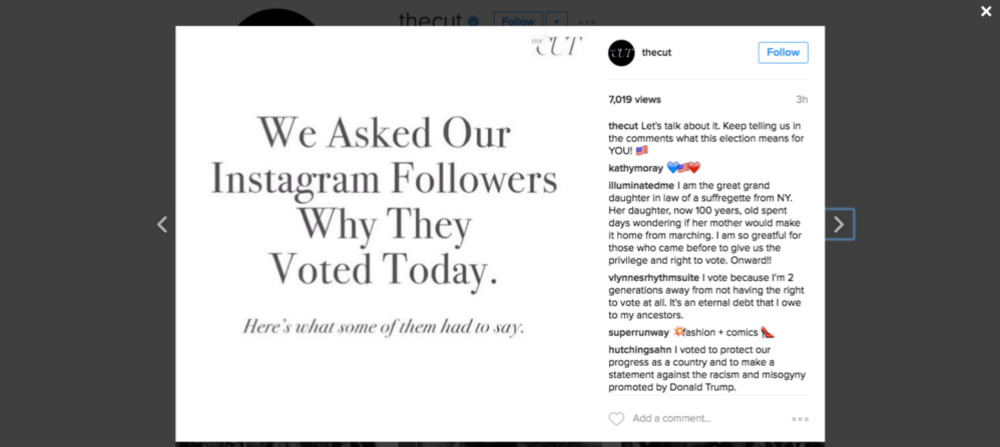 时尚网站The Cut此刻正在Instagram、Facebook、Twitter、Snapchat上创作原生内容。现在打开The Cut的Instagram账号,第一条就是一个视频节目,名叫“我们采访了几位粉丝,问了问他们为什么今天要投票。”据说,这个计划将搜集上百人参与,采编团队还会编辑图片集,标记到每个人的账号。