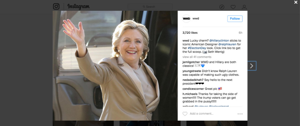 而Fashionista、Vogue、WWD的最新推送都一水地支持者希拉里,放的头图、选的标签都只有希拉里,仿佛川普在选举中并不存在。他们都毫无保留地将希拉里塑造成了新一代时尚女神,鼓励着粉丝关注她在最后一搏中的新装扮。