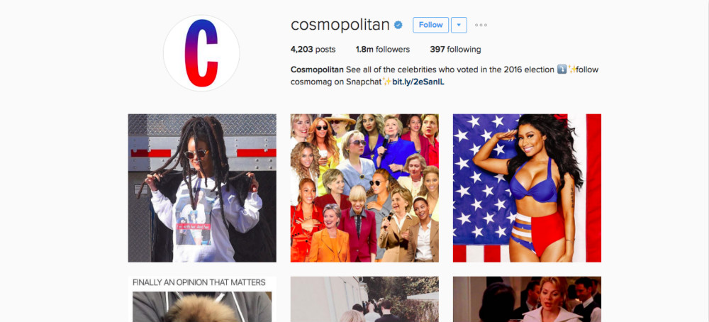Cosmopolitan网站也正忙得不可开交,不过和The Cut不同,Cosmopolitan将把重点全部放在Snapchat上,它的采编小队由10人组成,将创作19篇内容,包括选举的合法性、选举焦虑衡量度和一个用户之间可以转发投票的“I Voted!”推送。同样,这些内容也都会在网站和社交媒体上一并刊发。