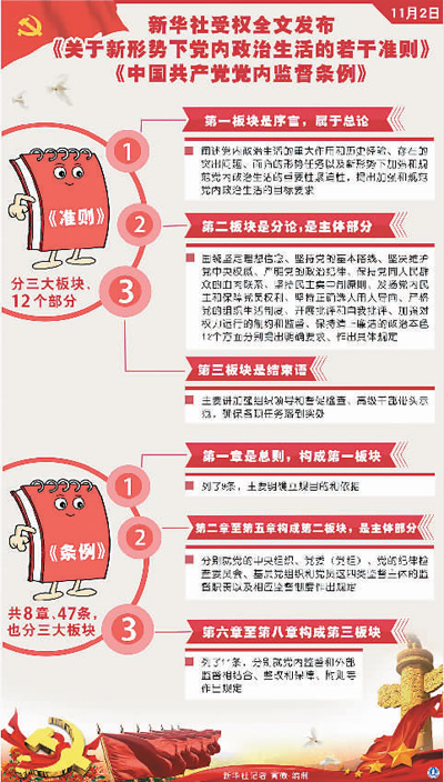 党的十八届六中全会审议通过的《关于新形势下党内政治生活的若干准则》和《中国共产党党内监督条例》,是新形势下加强和规范党内政治生活、加强党内监督的纲领性文献,是坚持思想建党和制度治党相结合、推进全面从严治党形成的新制度安排,是对马克思主义建党理论和实践的创新发展。