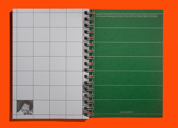 比如,新生手册不论是封面的插画还是内部的排版都比较另类。当然手册本身的黄黑配色也挺特别。而校历,他除了用了绿色银字的封面,还以油画艺术家Bob Ross的一张海景图填充了校历上空白的日子——除了校历重要日子外的空白格子里都被打散地放入了油画的一小部分,看到的人一开始可能会摸不着头脑,但看到最后会因为在封底看见完整的油画而豁然开朗。