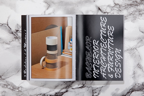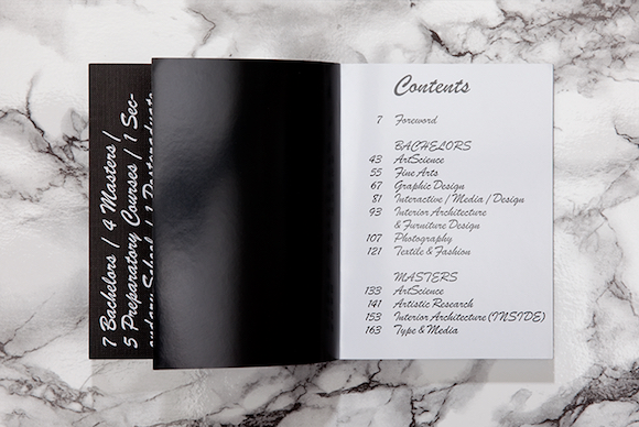 关于新生宣传册,他想要抓住的点是让学院的宣传册能从潜在学生同时收到的诸多其它宣传资料中脱颖而出。于是他选择了纯黑色的封皮,并用白色的字印上学院的名字,以及“Your Future in Art & Design(你在艺术和设计领域的未来)”这样的宣传标语。简单直接,没有多余的装饰。