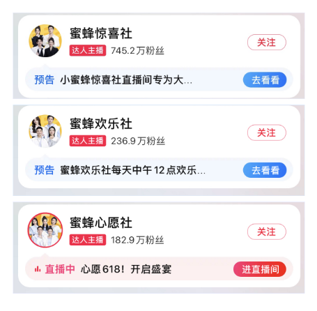 之后还陆续推出了“蜜蜂欢乐社”“蜜蜂心愿社”,主打下午场和上午场,与“蜜蜂惊喜社”一起在淘宝建立起了全天候的直播矩阵。