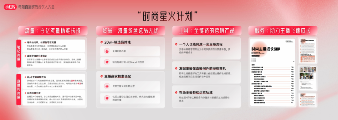 对直播电商的重视,于KOL而言是机遇,对平台本身来说则是多方资源的投入。今年3月,小红书“电商直播 时尚合伙人大会”上,宣布推出“时尚星火计划”,为主播提供百亿流量扶持、海量选品货盘、全链路营销工具以及助力主播成长的服务。