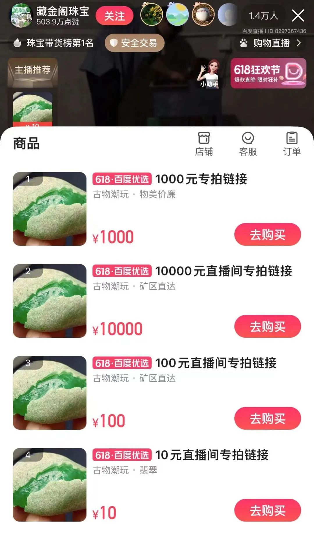 如今打开百度App,直播入口就处于右上角最显眼的位置,但是一进入百度直播的购物频道,其带货品类着实让人大开眼界,鸡内金、乌发液、渔网虾笼……但论流量大户,还是珠宝文玩,翡翠原石售价从10元到1万元不等,现场切割博人眼球。