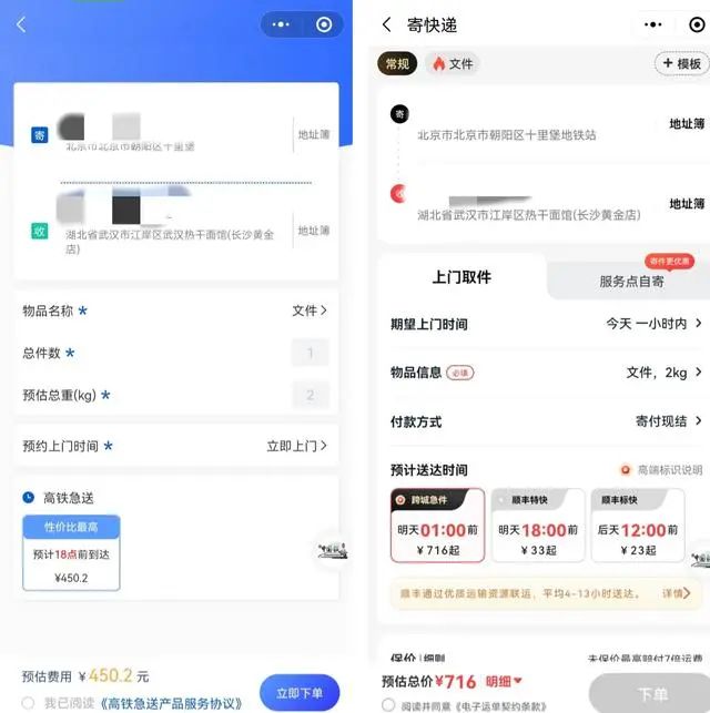 在价格方面,“高铁急送”比顺丰“专享急件”偏低,但大幅高于普通快递,甚至高于高铁票价。据界面新闻测试,以北京朝阳寄往湖北武汉为例,早上10:40下单“高铁急送”,预计当天18点前送达,价格为450.2元;而顺丰最快要次日凌晨1点送达,价格为761元。