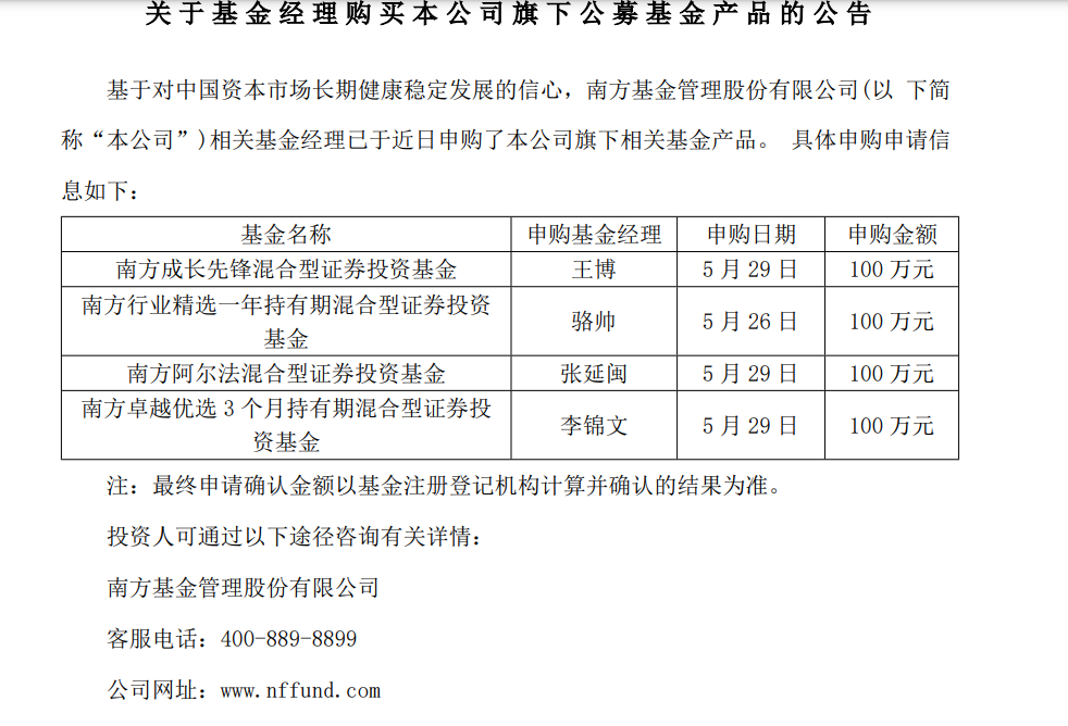 今日,南方基金公告称,基于对中国资本市场长期健康稳定发展的信心,公司相关基金经理已于近日申购了本公司旗下相关基金产品。