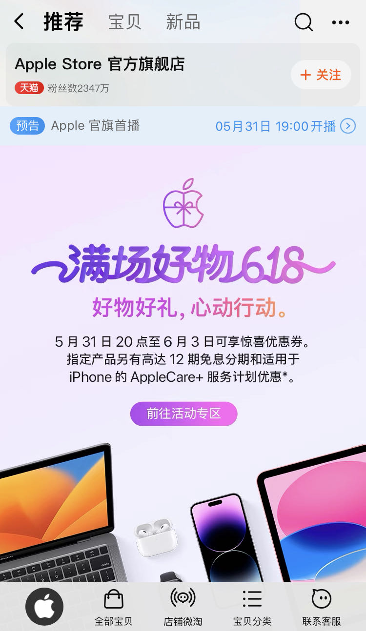 5月30日晚,Apple Store官方旗舰店挂出预告,将于2023年5月31日19:00点,在天猫开启Apple官旗首播。据了解,这也是苹果官方在电商平台的全球首次直播。